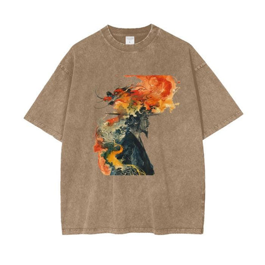 Abstract Watercolor Dragon Splatter Samurai Man Acid Wash Oversize T-Shirt - 250 GSM