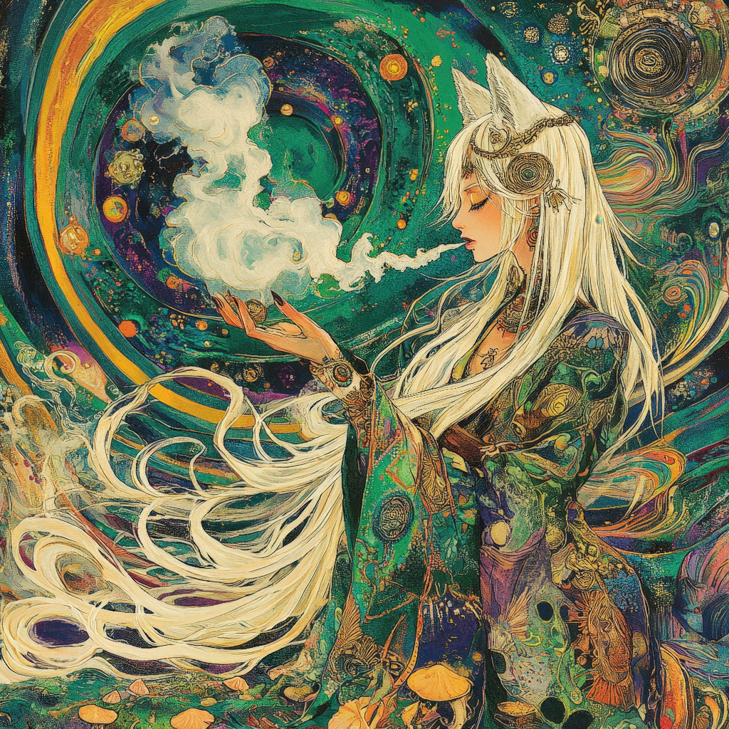- Design: White-haired fox man shaman with cosmic and Yokai-inspired elements