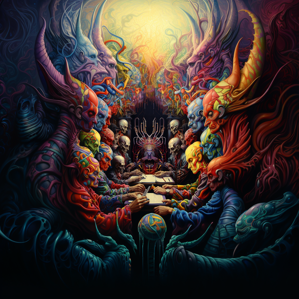 Dive into the depths of the cosmos with our Alien DMT Entities at Table Unisex Tee. This mind-bending graphic t-shirt features a stunning depiction of alien entities gathered around a table, inspired by DMT experiences and psychedelic visions. The vivid colors and intricate details are brought to life with ultra high-resolution printing on soft, premium Bella+Canvas cotton, ensuring a crisp and eye-catching design that’s perfect for any sci-fi or psychedelic enthusiast.