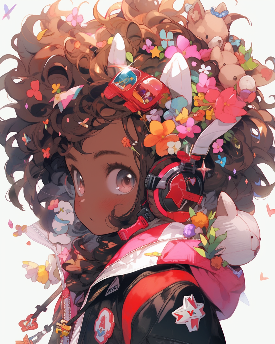 - Design: Kawaii anime girl with tan curly hair and colorful details