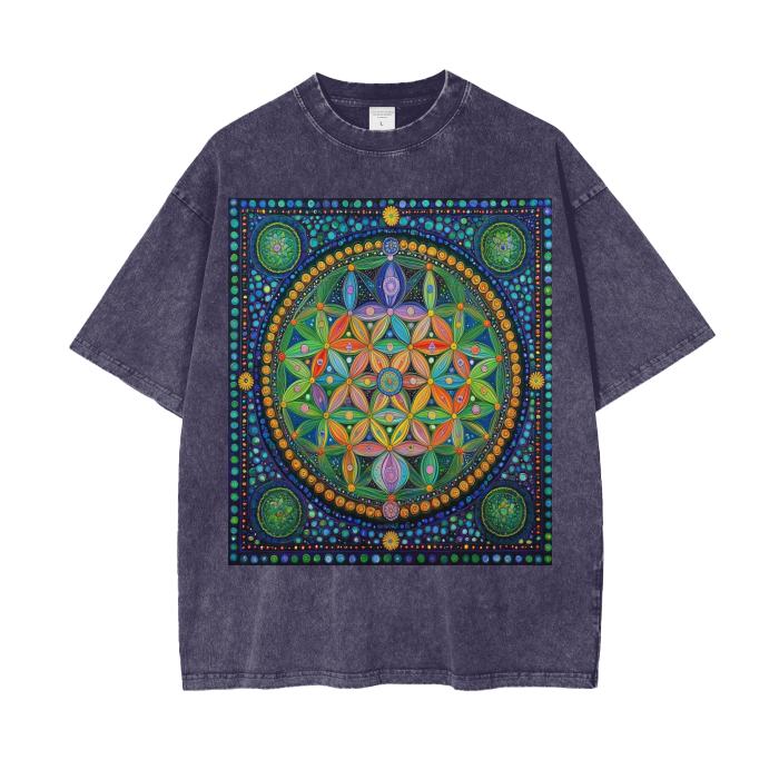 Lime Dotted Snow Flurrie Festival Flower of Life Chakra Mandala Burst Bordered Psychedelic Acid Wash Oversize T-Shirt - 250 GSML