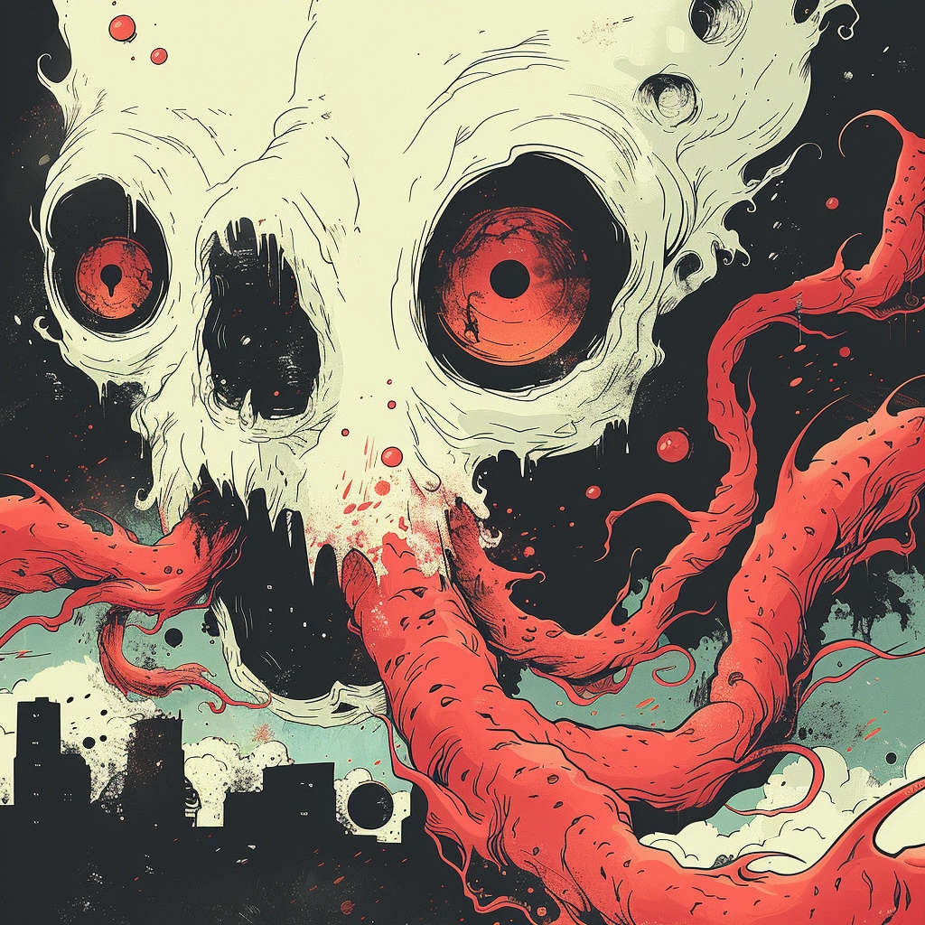 OctoSkull Zilla Over City Sepia Ink Art Unisex Tee