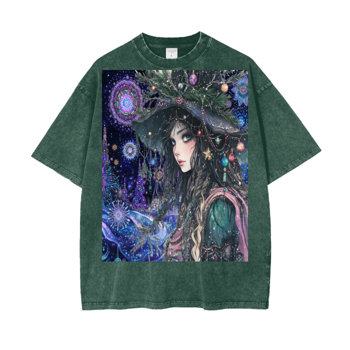 Winter Holiday Christmas Foliage Tree Goddess in the woods of Fractal psychedelic Neon Sky Acid Wash Oversize T-Shirt - 250 GSM